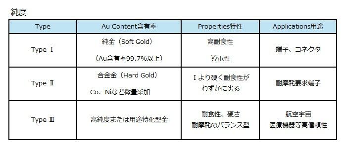 • 金純度(Type IIII)、膜厚クラス(0.12.5µm以上)を規定