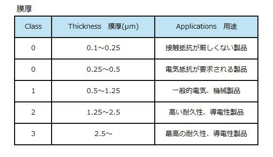 • 工業用目的(電機、電子、機械、その他機能的部品)の、有効面の膜厚2μm以上の金及び金合金電気めっきについて規定
