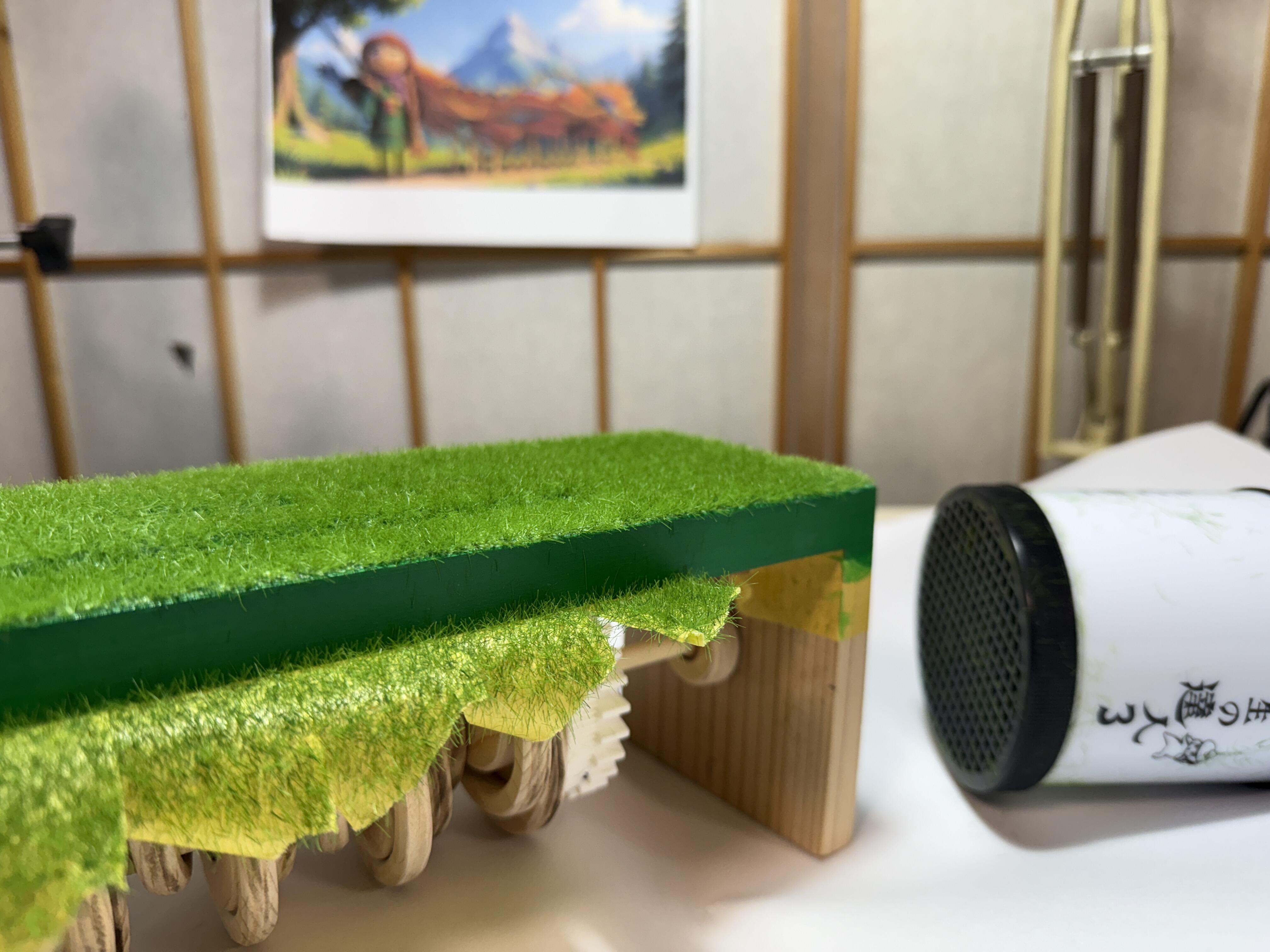 その上に5mmの緑色のスタテックグラス(ジオラマ用の短い繊維素材)をグラスマスター(静電植毛装置、グラスアプリケーター)という道具を使い、電機で静電気を発生させて、広範囲に毛立たせます。