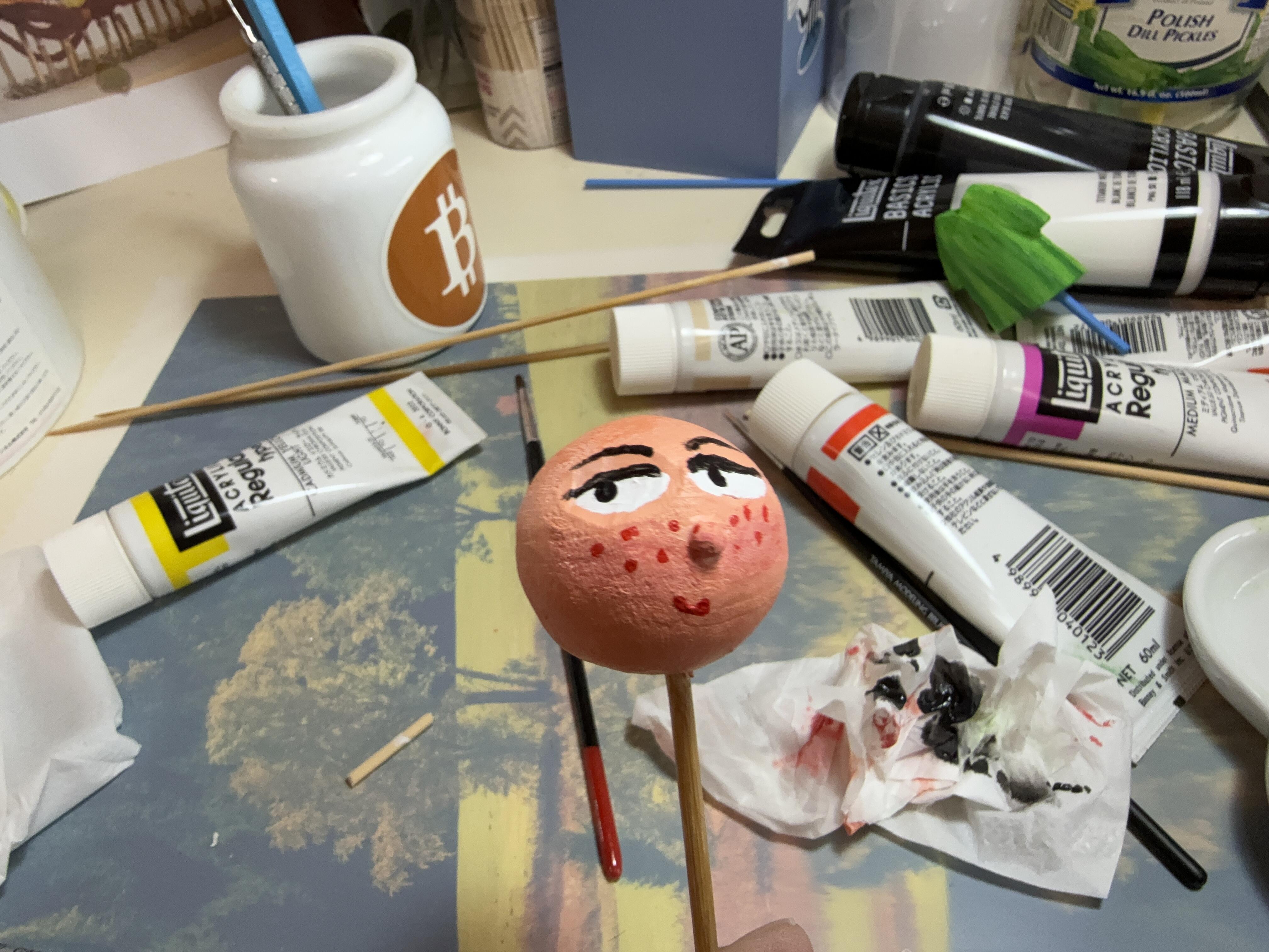 まず少女の顔をサンドペーパーで整え、リキテックスで顔を塗り始めます。なんといってもこの作品は少女の顔の表情がポイントになりますので緊張感100%マックスで取り組んでいくのです。