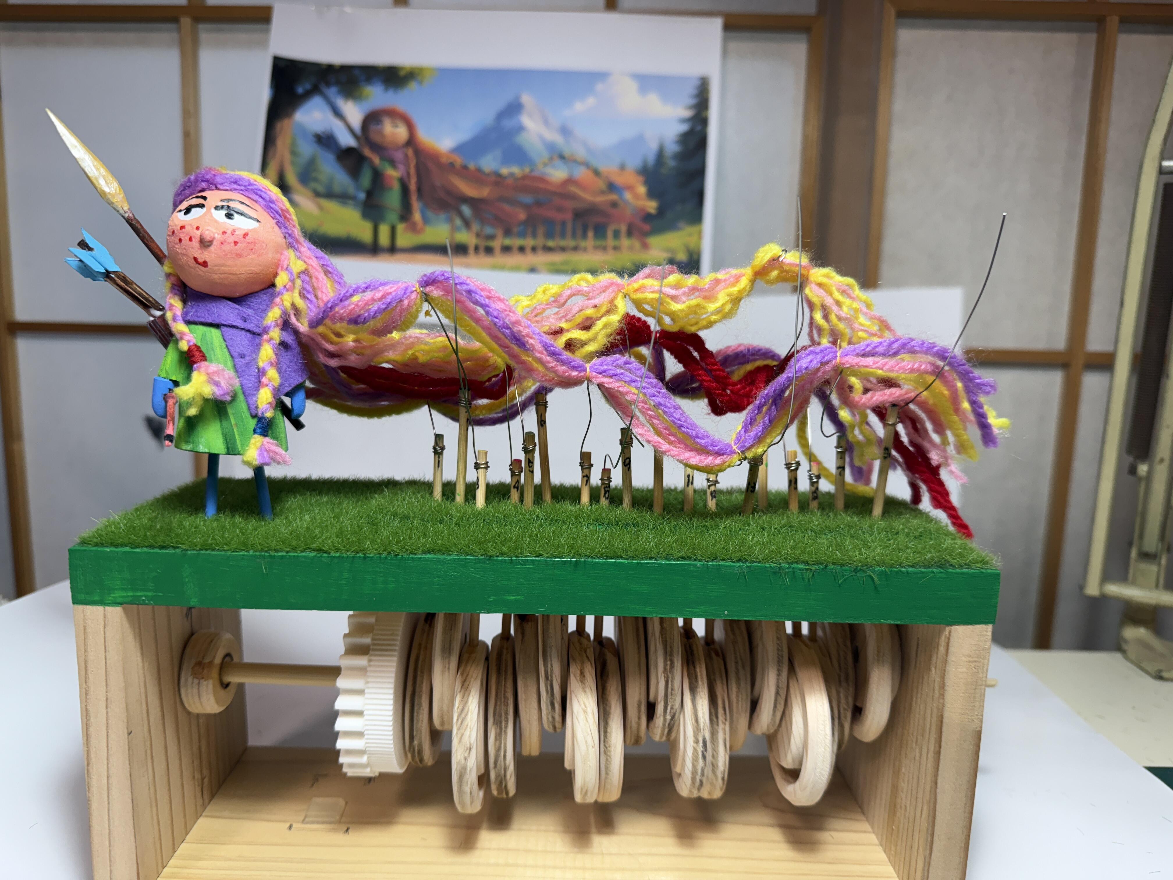 中にアクセントになる赤の毛糸をセットしたり、毛糸をほぐして髪の毛のホワホワ感を出す憎い?演出をしながら全体像を形作っていったのです。