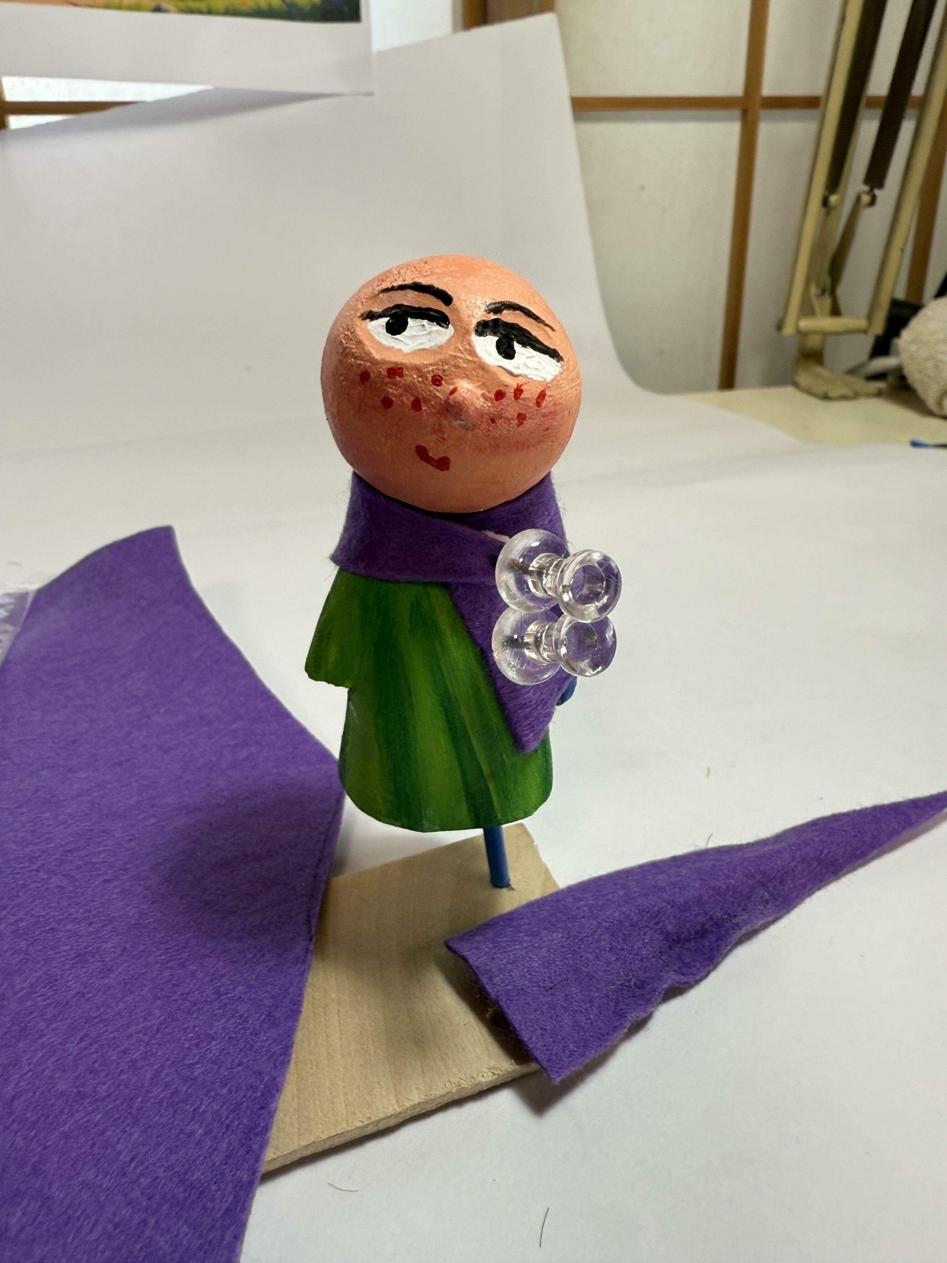 胴体も作り緑色の服を着せ?(塗っただけだけど・・)紫色のフェルトで風邪をひかないようにマフラーを作りました。