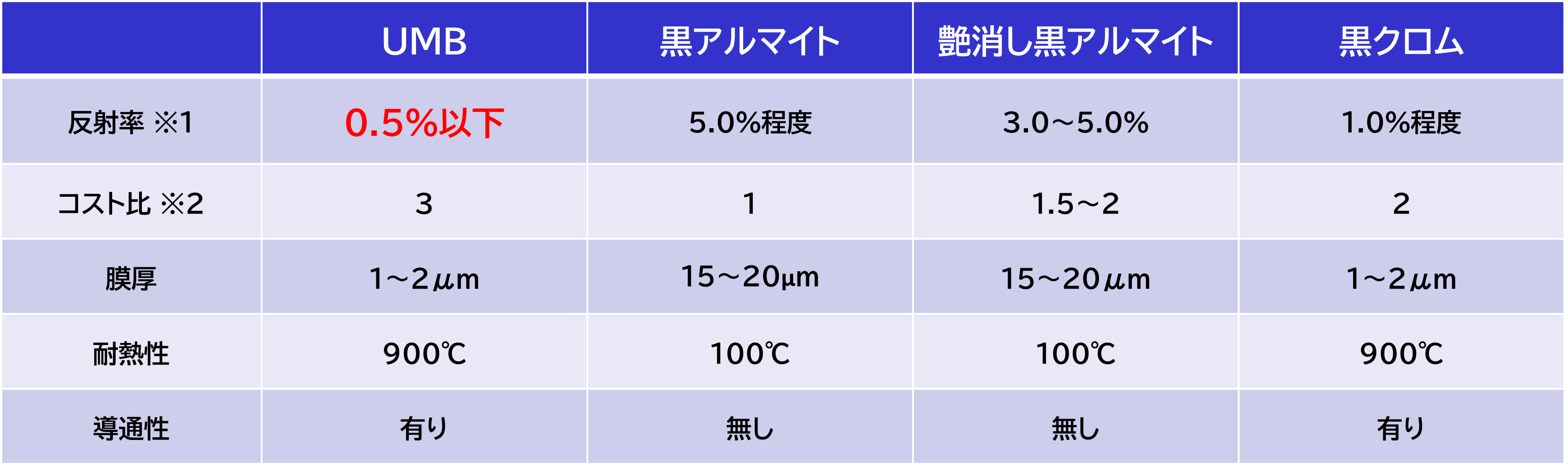 ①反射率 0.5%以下 ※一般的な黒アルマイトは5%程度となります。
