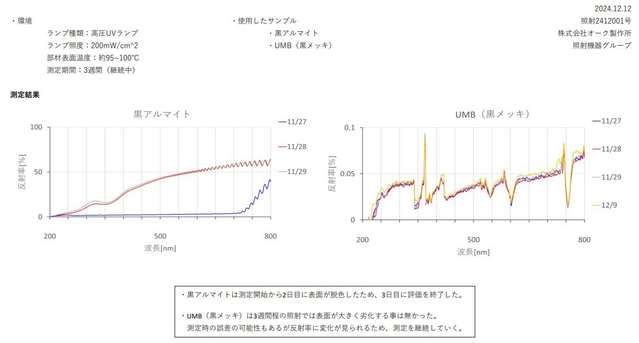 黒アルマイトは測定開始から2日目に表面が脱色。