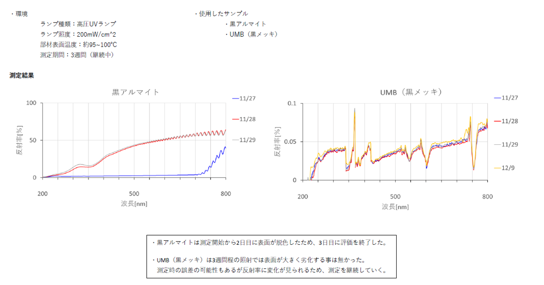 一方UMB処理は3週間程の照射でも表面が大きく劣化なし。