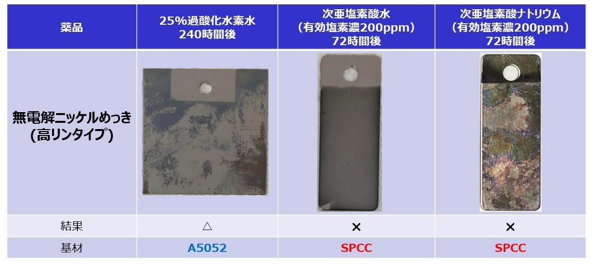ところが、次亜塩素酸に対して耐久性のあるめっきは今までなかった。耐薬品性に優れる高リン無電解ニッケルめっきでも効果は認められない。